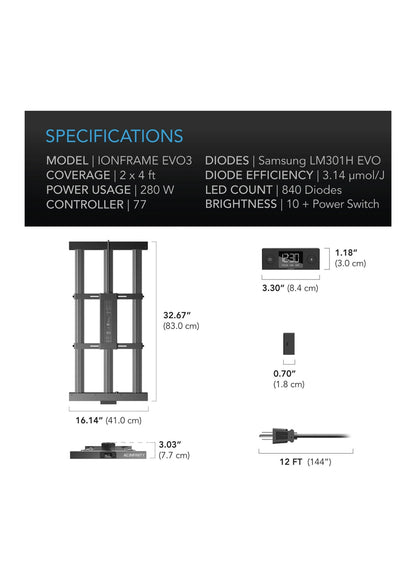 IONFRAME EVO3 LED Grow Light 280W | Samsung LM301H EVO Commercial LED Grow Light, 280W, 2x4 FT is a full-spectrum, high-efficiency LED panel engineered for premium plant growth in compact hydroponic systems and grow room setups. With Samsung LM301H EVO diodes at its core, this 280W fixture delivers intense PAR output and perfect spectral balance for every growth stage. Ideal for covering a 2x4 ft area, the EVO3 ensures uniform light distribution, excellent canopy penetration, and cooler running temperatures. Its low-profile bar-style design supports stable environmental conditions, helping protect the root zone while driving strong vegetative and flowering growth. This light is compatible with timers, climate systems, and automated irrigation setups, making it an excellent choice for hobbyists and professional growers seeking quality, efficiency, and full-spectrum control. Key Features: 280W full-spectrum LED with Samsung LM301H EVO diodes Covers 2x4 ft for balanced hydroponic systems and tents Ideal for seed-to-harvest lighting cycles Uniform PAR distribution enhances nutrient delivery Low heat output preserves root zone conditions Slim, passively cooled design with silent operation Works with automated irrigation and smart grow controllers Optimized for space-efficient grow room performance